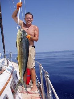 At 3:30pm, while Rod was below taking his afternoon nap and I was at the helm the fishing line that we were trolling with came alive. FISH ON!!! And it was a big one! Rod’s nap was over. I slowed Lucky Peek down while Rod started reeling in the line (we’re still using the caveman hand line). We could see the flashes of bright blue, green, and yellow in the water about 75 feet behind us and knew that we had a dolphin fish on the line (Mahi Mahi, not Flipper). And then it confirmed its identity and size by flying out of the water, dancing in the air and fighting hard against the pull of the line. What a sight! Rod was reeling it in, then letting some line out, then reeling it in. Meanwhile, my adrenaline is surging while I’m taking the boat out of gear, easing out the main sheet to slow us down, turning the auto-pilot on, getting the gaff out of the starboard lazarette, getting the big net out of the port lazarette, getting the long handle for the big net off the port side of the cabin top, attaching the long handle to the big net – dang it! I can’t get those metal knobby things to push in so the handle can click on! There, I got it! Getting a line and making a slip knot in it so we can tie it to its tail. Slip knot! I’ve just mastered the bowline, can I remember how to make a simple slip knot?! The pressure! There, I got it on the first try! Getting the giant bottle of cheap vodka (not the Ketel One) to use to stun and sedate the fish – I think I need a swig. Rod now has the Mahi Mahi alongside the boat. The colors are stunning and we could now see that we were about to bring aboard a 4 foot female. The male dolphin fish has a very distinct flat forehead and the females, like the one on our line, have a more rounded head. She was getting worn out and was not fighting as hard now. We can tell that she’s definitely not going to fit in the net but we want to try and stop her from swimming about and possibly losing her. She doesn’t like the net. When I put it in the water and try to scoop her head into it she goes crazy and dives deep – yanking the Cuban reel (caveman handline spool-like yo-yo thing) right out of Rod’s hands! Fortunately, one of the things I had done among my other frantic tasks was put the orange rubbery gloves on Rod’s hands earlier on in the reeling, so now he was able to hold directly on to the line. Now I’m using the big net on the long handle to scoop the Cuban reel out of the water! Got it! Rod suggests to me that I turn away as he needs to use the gaff on the fish to get it aboard. I do as he suggests. But then he needs my help – I am to take the line with the slip knot, loop it around the tail, pull it tight and tie the other end to the boat. I somehow manage this in between getting flipped in the head with wild tail flaps. We follow the advice of other fisherman and cover her eyes with a towel so she’ll calm down. She’s on the deck of the boat now. I’m giving her a stiff drink in the gills from the vodka bottle. I’m witnessing with my own eyes now what I’d read about and heard in other fish stories – as the dolphin fish gets anxious its colors actually change, and when they die all the colors fade away to a muted grayish green. As her color started fading my vision becomes severely blurred. I go to the cockpit and sob. (In fact my vision is blurring as I write this.) I may be a sailor but I’ll never be a fisherwoman.