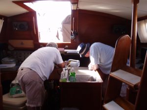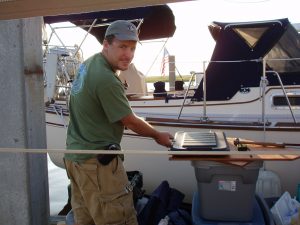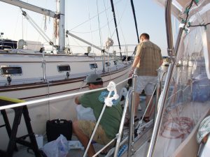 The first week of October was thunderous and very wet due to Tropical Storm Tammy passing just south of us. We received somewhere around 16 inches of rain in 6 days and we had a couple of restless nights on the leading edge of the storm with the thunder shaking the boat and the lightening getting a little too close for comfort. There were many areas of Brunswick that experienced flooding that week, and we were not immune to the wet living conditions either. After discovering a soggy rug and a soaked settee cushion, we deduced that some areas of the boat were not water tight. We have added “rebed chain plates” to our list of projects. Fortunately that’s not a complex project and it’s one that needs to be done as a normal part of boat maintenance. Guess it was time for ours to be maintained.